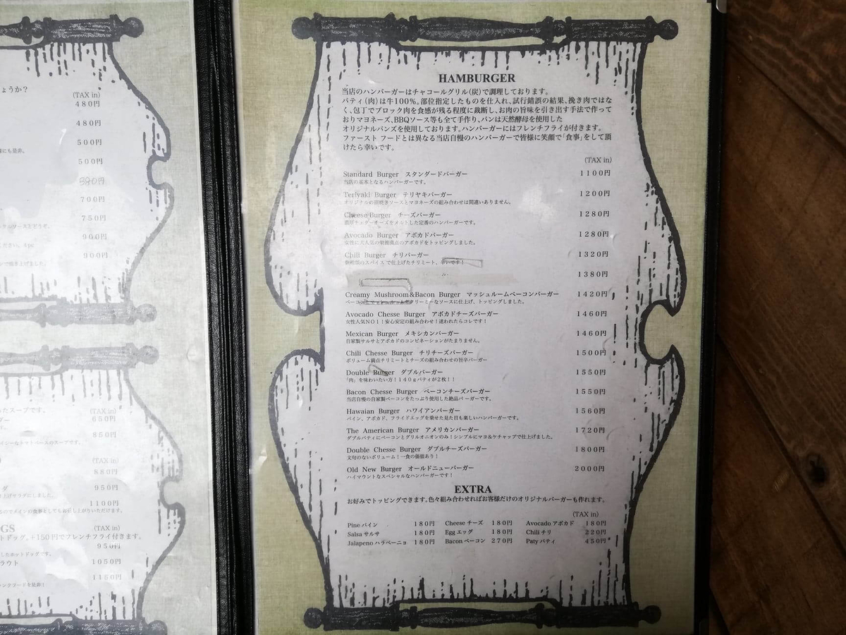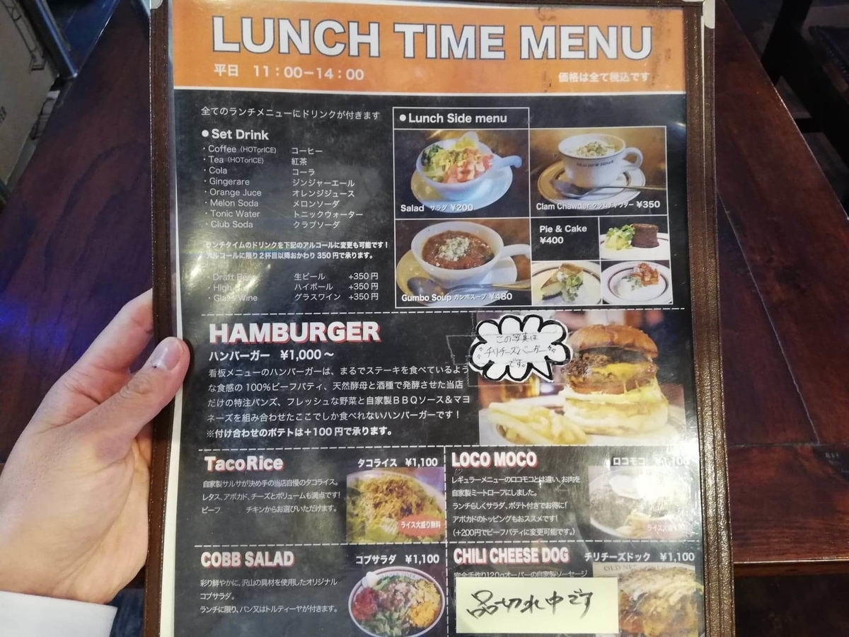 ランチメニューはこちら!ハンバーガー以外にもロコモコやトルコライスなど、米系もあります。