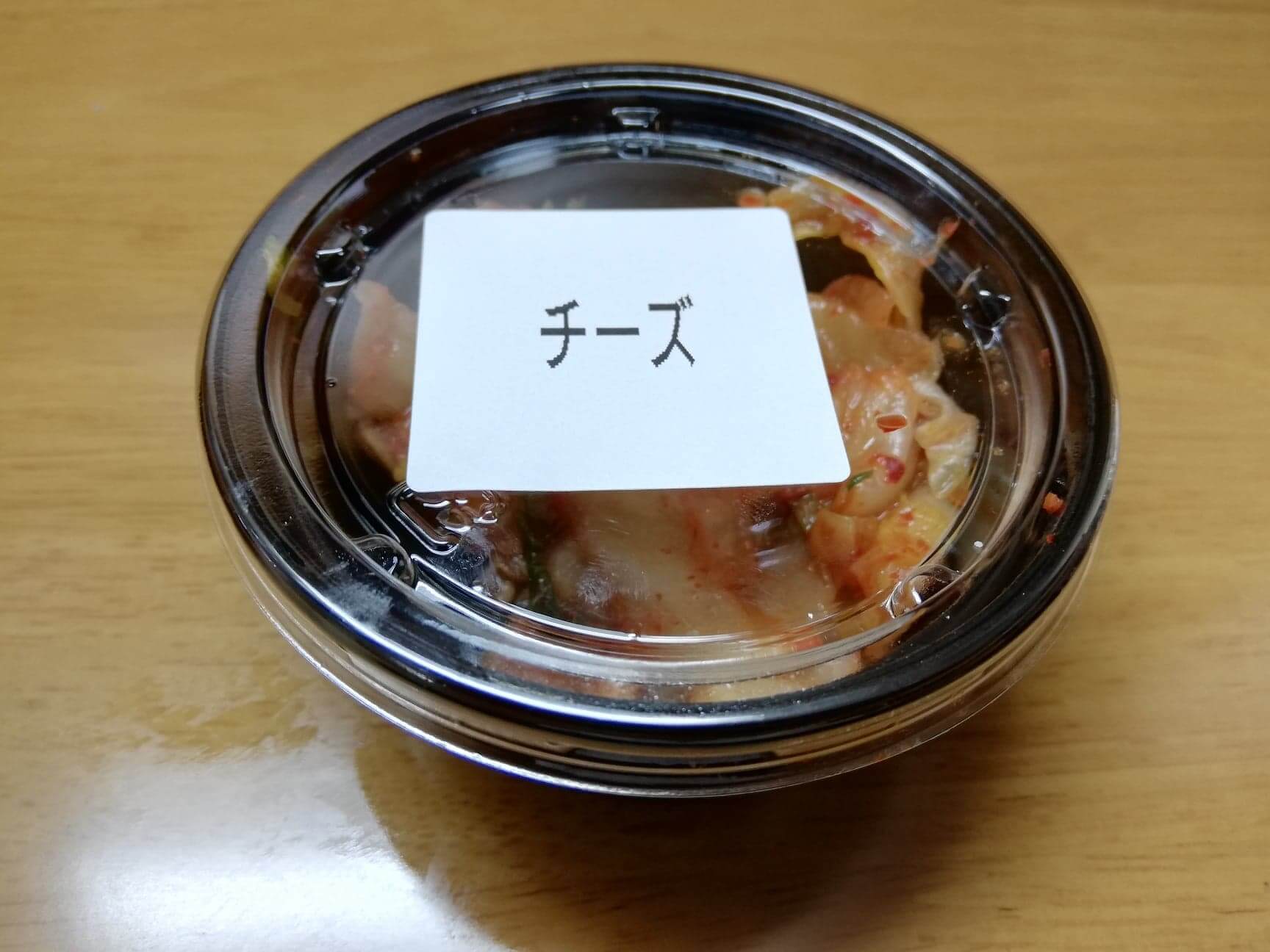 あまりに頼みすぎたからかキムチのカップにチーズシールが貼ってありました。